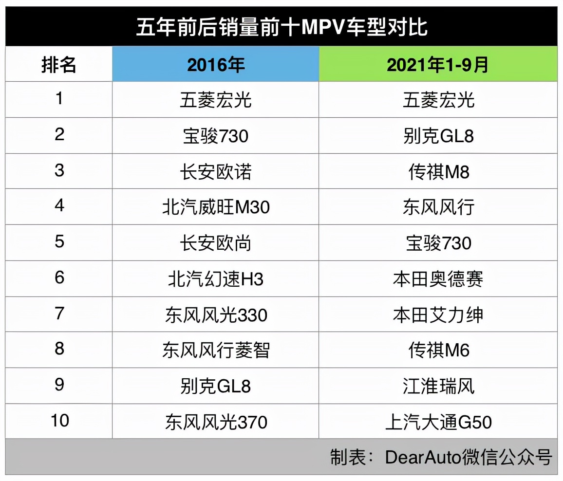 2016年,銷量前十的MPV車型中,除了別克GL8這款定位相對高端的合資MPV之外,其余均為來自中國品牌,定位較低端的車型。時隔5年,再看今年1-9月,傳祺M8、M6、本田艾力紳、奧德賽已經穩居前十,別克GL8的排名更是晉升至第二名。