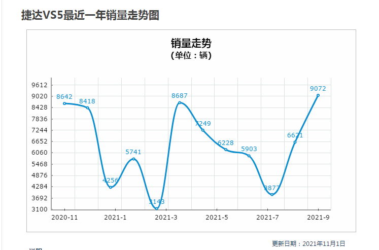 捷達家族的旗艦車型VS7,在2021年過去幾個月,月銷量徘徊在2000-3000輛之間。9月算是有突破,賣出了4500多輛。而銷量最好的VS5,銷量也是相當的飄忽,從3月的8687輛開始,VS5銷量直線下降,到7月僅售出2877輛。然而到了9月又飆升至9072輛。如果按2021年累計銷量,VS5累計銷量為56521輛,在SUV中銷量排名第23名……