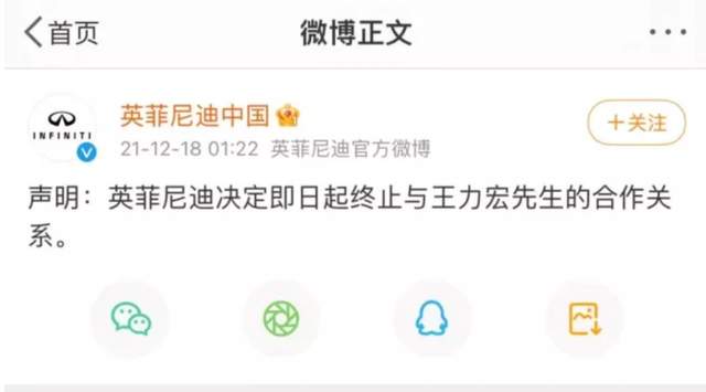 幾個小時后的18日凌晨1點22分,英菲尼迪就刪除了王力宏的所有信息,宣布解約。