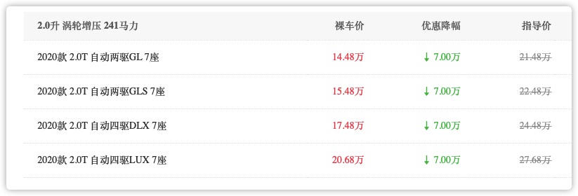 定價方面,2020款起亞KX7共有4款車型,指導價為21.48萬至27.68萬,看上去價格并不算便宜,屬于中規中矩的價格,但是如今很多終端經銷商已經給出了7萬元的降價幅度,以入門版21.48萬的2.0T自動兩驅GL 7座版車型為例,優惠后僅14.48萬。不到15萬的價格就可以購買到一款合資7座2.0T自動擋SUV,似乎真的是一個很具性價比的選擇,畢竟很多品牌在15萬左右大部分都是尺寸更小的緊湊級SUV,甚至小型SUV。