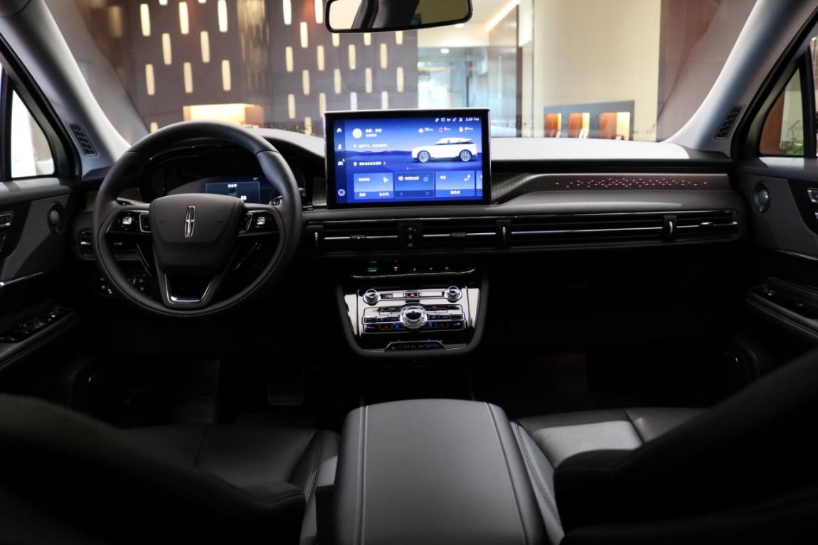 12.3寸全液晶儀表盤+12.8寸中控屏的組合提升了內飾的科技感,排列有序的物理按鍵很有韻律感,同時,內置的第三代林肯SYNC+智行互聯系統,涵蓋語音交互、導航、娛樂等等功能,另外,該系統相較于上一代產品還新增了車路協同功能,能夠通過實時錄入前方交通信號燈信息,實現綠燈提示、綠波引導、紅燈警示等功能。