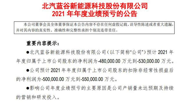 雖然北汽新能源在國內推出的時間并不晚,但是銷量業績卻一直不盡人意。北汽新能源上市公司北汽藍谷近期發布的公告顯示,預計2021年凈利潤為-48億元到-53億元。而這也是在2020年巨虧64.8億元后的業績再次下滑。如果2022年業績仍不能轉暖,那么北汽藍谷或將面臨退市警告。