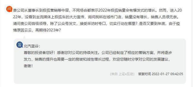 銷量的慘淡引發了不少質疑,有投資者質疑作為當前極狐旗下備受關注的極狐阿爾法 S HI 版展車早在今年1月26日亮相北京銀泰in01華為店,為何卻不見任何宣傳?每年數億元廣告宣傳及運營費用究竟花在了哪?也有網友直言“除了公眾號發文、接受采訪時夸口,切實行動在哪里?類似的質疑,在股吧等平臺并不鮮見。