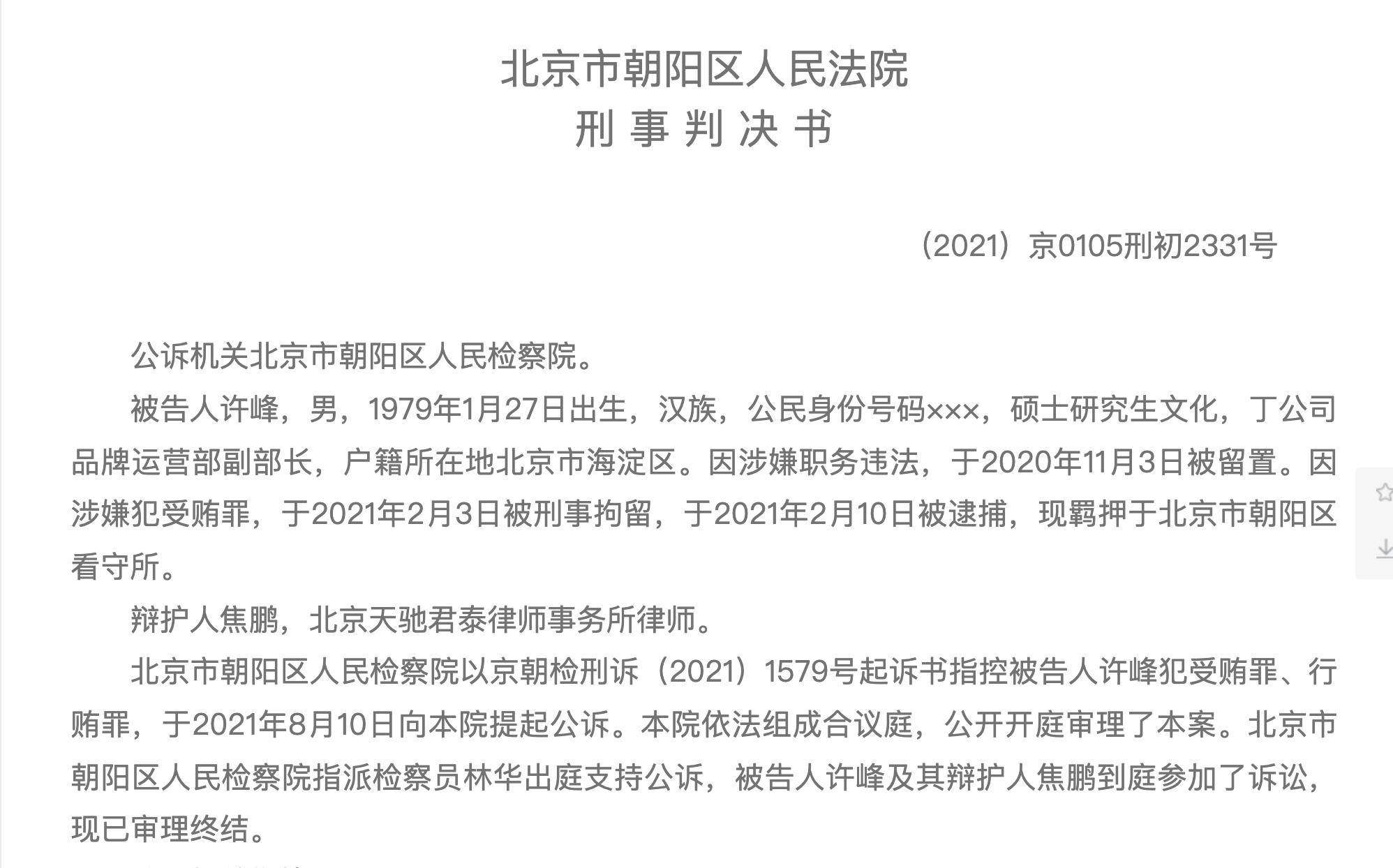 屋漏偏逢連夜雨,近日又有消息稱北汽新能源前營銷傳播部總監助理許峰涉嫌貪腐被查后已被判刑。北京法院審判信息網公布的《許某受賄一審刑事判決書》顯示,北汽新能源營銷公司許峰身為國家工作人員,利用職務便利,為他人謀取利益,伙同妻子李某非法收受他人財物,同時還伙同他人給予國家工作人員以財物,因構成受賄罪、行賄罪,被一審判處有期徒刑七年,在案之錢款,予以沒收,并處罰金人民幣三十萬元。此外,時任公司營銷傳播部部長曹斌也被另案處理。
