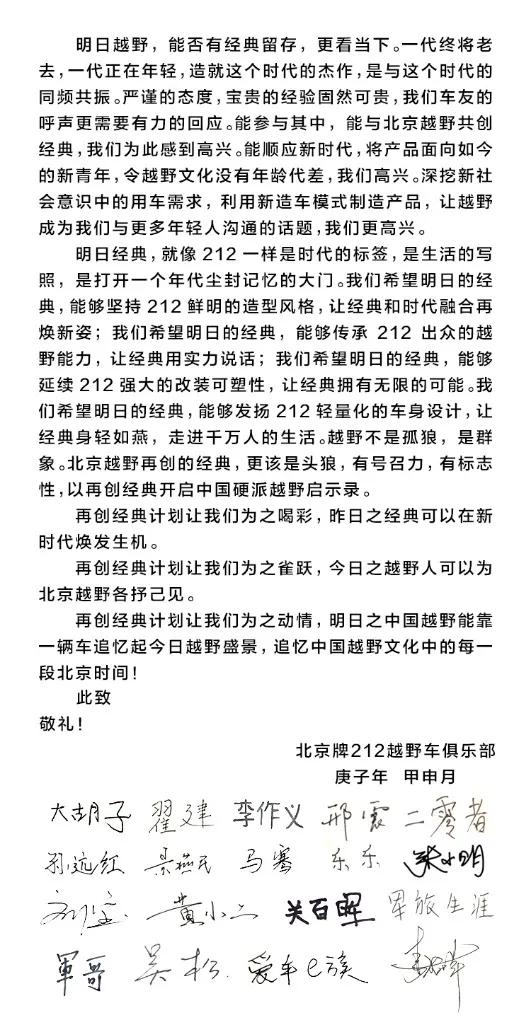如同212車友在家書中所言,“明日越野,能否有經典留存,更看當下”,“明日之中國越野能靠一輛車追憶起今日越野盛景,追憶中國越野文化中的每一段北京時間”。如果說212之于北京越野是一段值得銘記的光輝歲月,那么“再創經典”之于北京越野,則是再造越野盛景的莊嚴使命,可以預見的是,它再創的經典,必定精彩!