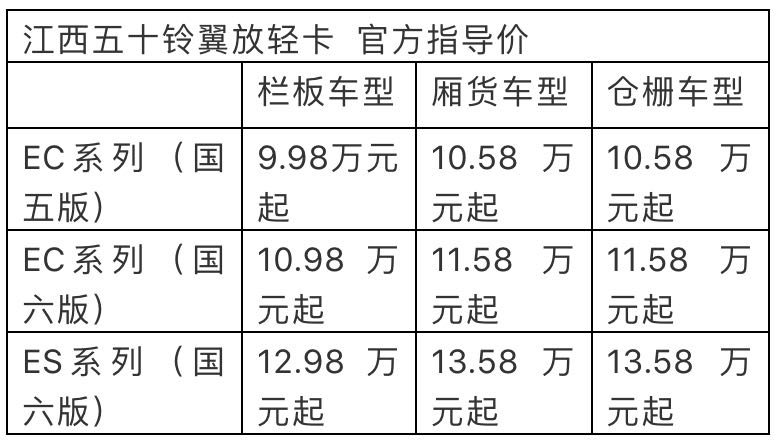 針對中國市場輕卡用戶的不同需求,江西五十鈴翼放輕卡共推出了 ES 系列和 EC 系列的多款車型,官方指導價 9.98 萬元起。