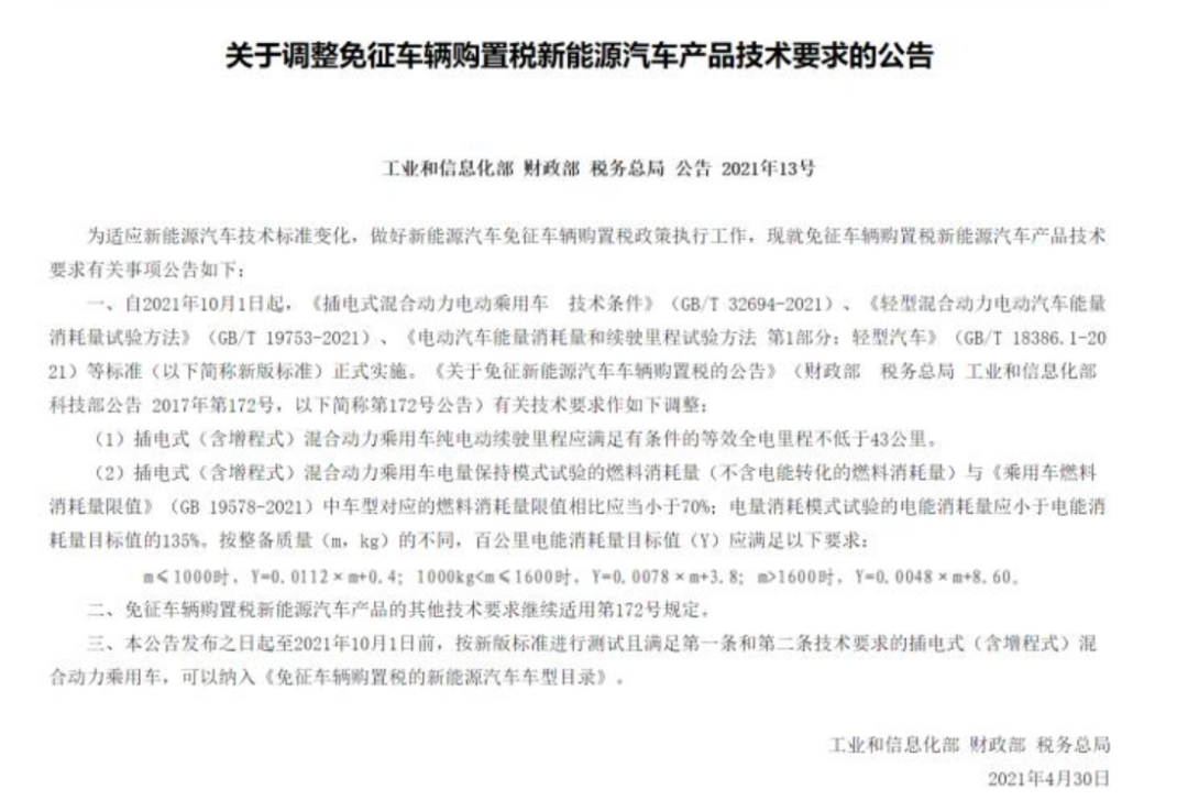 日前,工信部、財政部、稅務總局聯合發布《關于調整免征車輛購置稅新能源汽車產品技術要求的公告》稱,插電式(含增程式)混合動力乘用車純電動續駛里程應滿足有條件的等效全電里程調整為不低于43公里。免征車輛購置稅新能源汽車產品的其他技術要求繼續適用第172號規定。