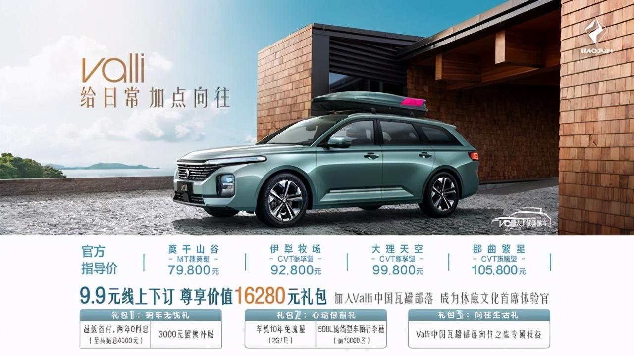 自上市之日起,廣大用戶通過新寶駿APP/新寶駿汽車小程序/菱菱邦APP/京東、天貓官方旗艦店等平臺,僅需9.9元線上下訂,可享受價值16280元禮包,包括三重大禮。禮包1:購車無憂禮——超低首付,兩年0利息(至高貼息4000元),3000元置換補貼;禮包2:心動驚喜禮——車機10年免流量(2G/月),500L流線型車頂行李箱(前10000名);禮包3:向往生活禮——Valli中國瓦罐部落向往之旅專屬權益。用戶加入Valli中國瓦罐部落,即可成為休旅文化首席體驗官。(注:禮包1、2不含手動擋)