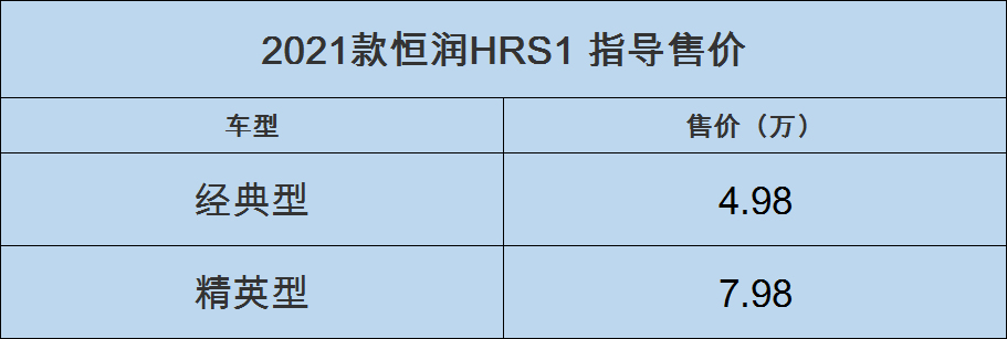 2021款恒潤HRS1有兩款車型上市,指導價分別是4.98和7.98萬。工信部純電續航里程305km,均搭載28.2kWh的磷酸鐵鋰電池,慢充時間12小時,經典型無快充,精英型快充時間1.5小時。電動機功率為32kW,峰值扭矩140N·m。
