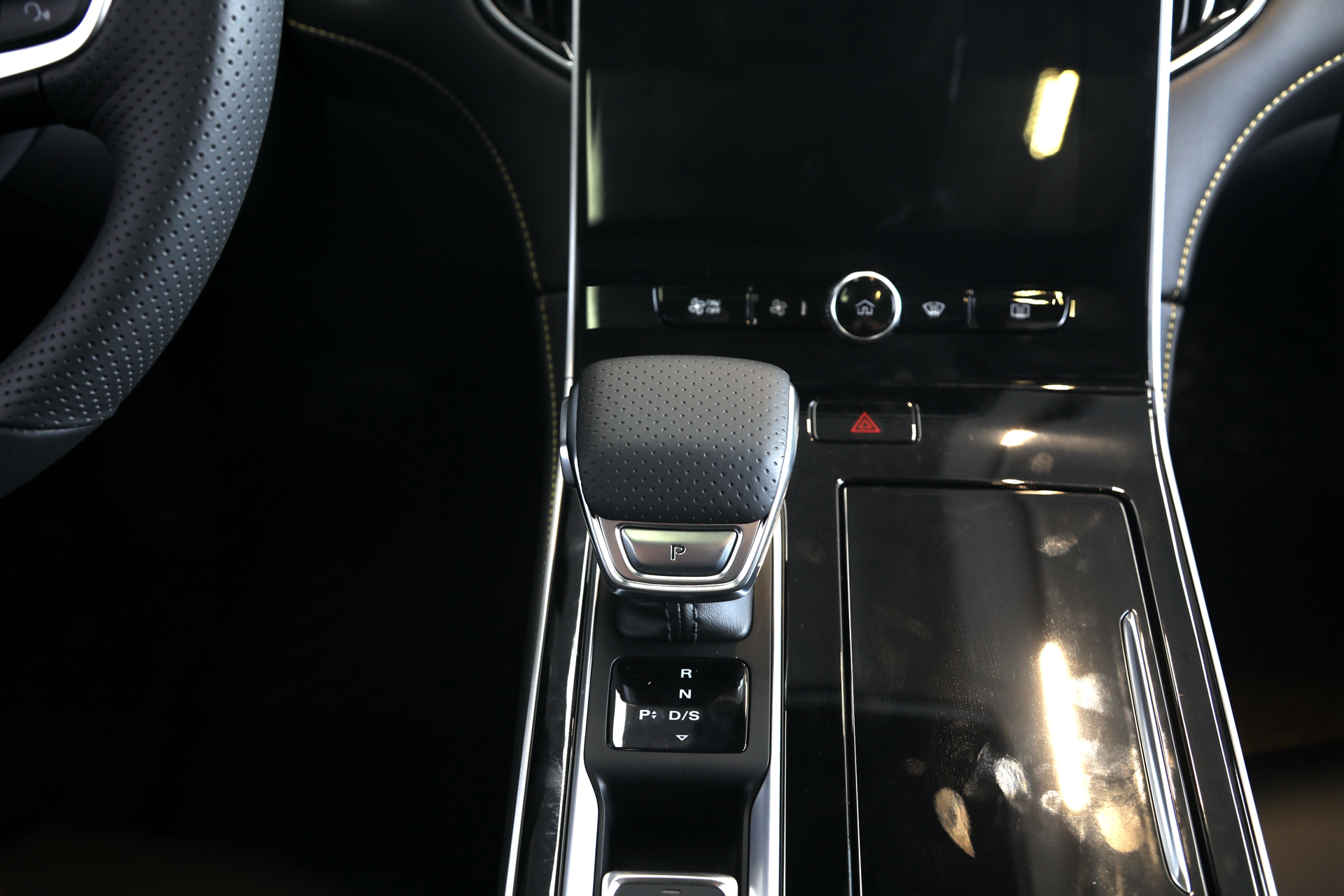 電子擋把的造型比較小巧,使用了打孔皮材質以及鍍鉻材質進行包裹,手感比較出色。擋把周圍區域使用了高亮鋼琴漆面板進行裝飾,質感比較出色,但容易 沾染指紋。