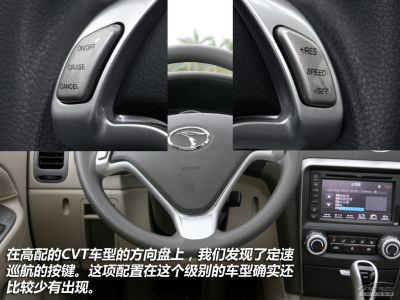 在內飾方面,CVT版的V3菱悅做了一些改動。首先是把所有車型都換上了炮筒式的儀表盤,而且數值的讀取也變得更加的清晰便捷。在高配的CVT車型的方向盤上,我們發現了定速巡航的按鍵。這項配置在這個級別的車型確實還比較少有出現。