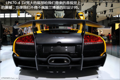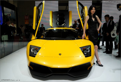 09年上海車展豪華品牌齊聚E4館,此次車展雖然蘭博基尼只帶來了兩款車,但這絲毫沒有影響到蘭博基尼的人氣,一頭黃色的“狂牛”在聚光燈下十分的咋眼。Murcielago LP670-4 SuperVeloce——蘭博基尼公司新添的一款極其張揚的頂級跑車,在動力、速度各方面都比LP670更勝一籌,6.5L V12引擎、670匹馬力、660Nm的扭矩、3.2秒完成百公里加速、極速342公里/小時……一切的參數都在告訴我們眼前這臺全球限量350臺的的“狂牛”的真正實力,下面就請大家隨著我們的鏡頭一起體驗Murcielago LP670-4 SuperVeloce。